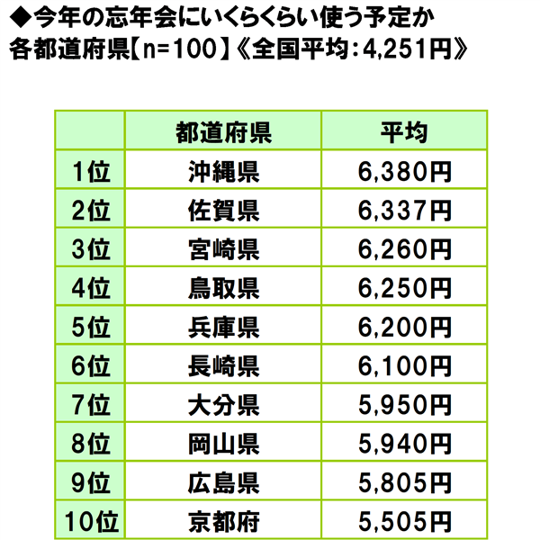 次に、今年の忘年会にいくらくらい使う予定か聞いたところ、平均額は1位「沖縄県」(6,380円)、2位「佐賀県」(6,337円)、3位「宮崎県」(6,260円)となりました。また、4位に「鳥取県」(6,250円)、5位に「兵庫県」(6,200円)が挙がるなど、TOP10は西日本が独占しました。