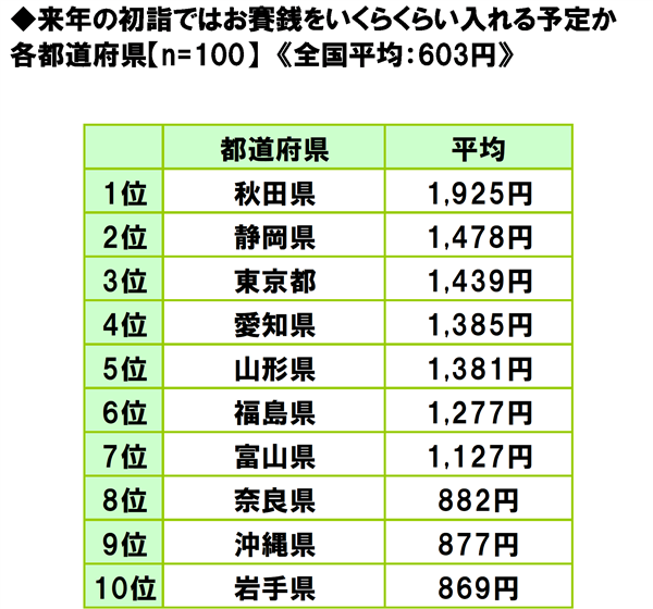 来年の初詣ではお賽銭をいくらくらい入れる予定か聞いたところ、平均額は1位「秋田県」(1,925円)、2位「静岡県」(1,478円)、3位「東京都」(1,439円)となりました。
