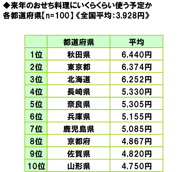 来年のおせち料理にいくらくらい使う予定か聞いたところ、平均額は1位「秋田県」(6,440円)、2位「東京都」(6,374円)、3位「北海道」(6,252円)となり、秋田県は“今年のクリスマス予算”“来年のお賽銭予算”“来年のおせち料理予算”で1位となりました。