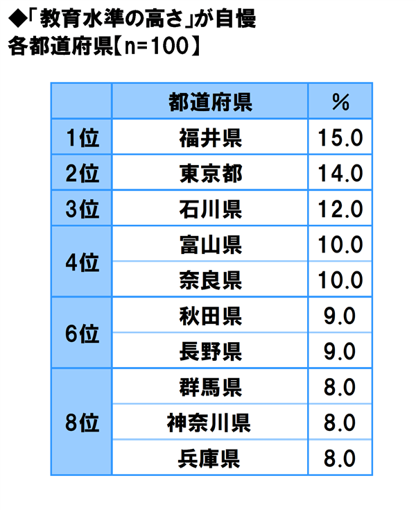 教育や子育てについてみると、【教育水準の高さ自慢】では、1位「福井県」(15.0%)、2位「東京都」(14.0%)、3位「石川県」(12.0%)と、福井県は6年連続1位となりました。