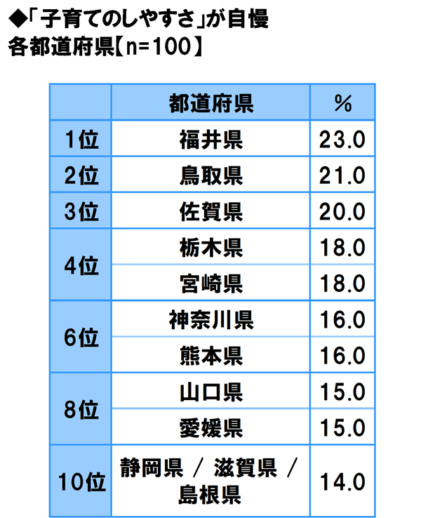 【子育てのしやすさ自慢】では、1位「福井県」(23.0%)、2位「鳥取県」(21.0%)、3位「佐賀県」(20.0%)となり、福井県が【教育水準の高さ自慢】、【子育てのしやすさ自慢】ともに1位となりました。