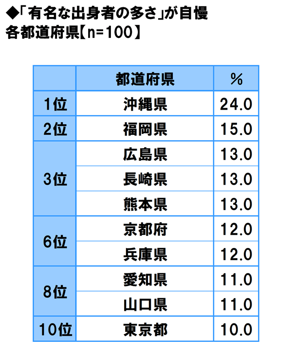 【有名な出身者の多さ自慢】では、1位「沖縄県」(24.0%)、2位「福岡県」(15.0%)、3位「広島県」「長崎県」「熊本県」(同率13.0%)でした。沖縄県は前回調査に引き続き1位となりました。