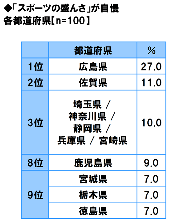 【スポーツの盛んさ自慢】では、1位「広島県」(27.0%)、2位「佐賀県」(11.0%)、3位「埼玉県」「神奈川県」「静岡県」「兵庫県」「宮崎県」(同率10.0%)となり、5年連続で広島県が1位となりました。