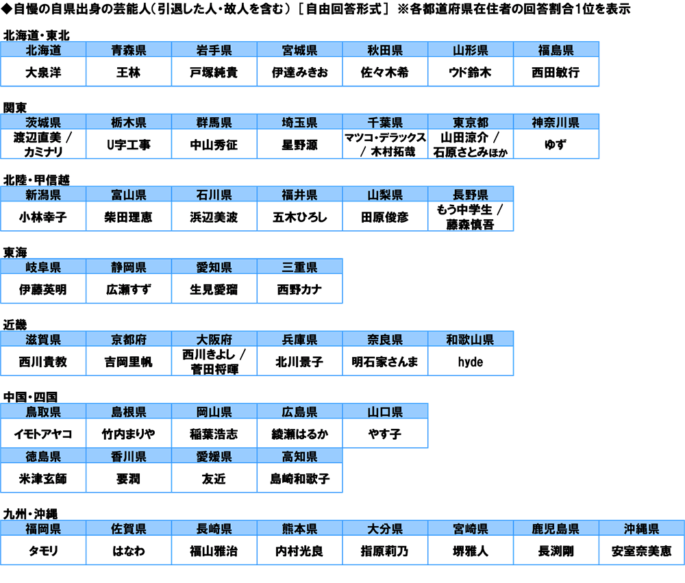 各都道府県の在住者(各都道府県100名)に、自慢の自県出身の芸能人(引退した人・故人を含む)を聞いたところ、北海道では「大泉洋さん」、岩手県では「戸塚純貴さん」、山形県では「ウド鈴木さん」、福島県では「西田敏行さん」、茨城県では「渡辺直美さん/カミナリ」、群馬県では「中山秀征さん」、埼玉県では「星野源さん」、神奈川県では「ゆず」、新潟県では「小林幸子さん」、福井県では「五木ひろしさん」、愛知県では「生見愛瑠さん」、三重県では「西野カナさん」、京都府では「吉岡里帆さん」、大阪府では「西川きよしさん/菅田将暉さん」、和歌山県では「hydeさん」、鳥取県では「イモトアヤコさん」、島根県では「竹内まりやさん」、岡山県では「稲葉浩志さん」、広島県では「綾瀬はるかさん」、香川県では「要潤さん」、愛媛県では「友近さん」、高知県では「島崎和歌子さん」、福岡県では「タモリさん」、熊本県では「内村光良さん」、宮崎県では「堺雅人さん」、沖縄県では「安室奈美恵さん」といった芸能人が挙げられました。