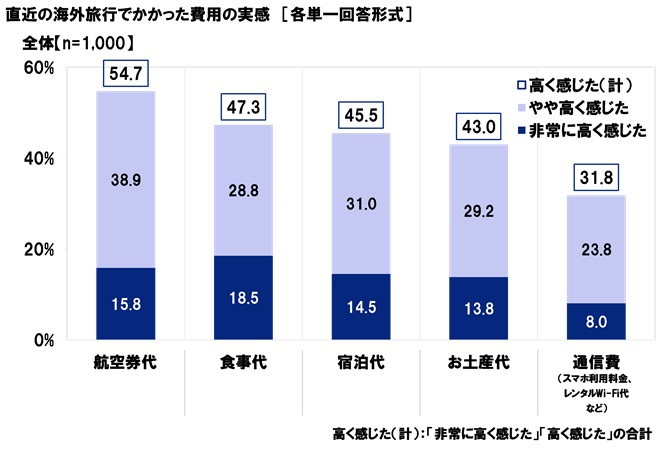 直近の海外旅行でかかった費用について『高く感じた』(「非常に高く感じた」「やや高く感じた」の計)と回答した人の割合をみると、“航空券代”(54.7%)が最も高く、次いで“食事代”(47.3%)、“宿泊代”(45.5%)、“お土産代”(43.0%)、“通信費(スマホ利用料金、レンタルWi-Fi代など)”(31.8%)の順となっている。