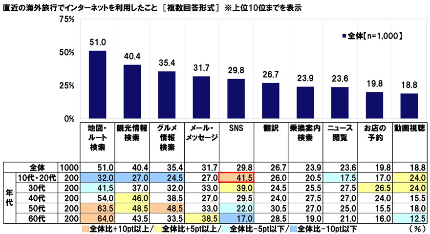 直近の海外旅行でのインターネット利用目的は、「地図・ルート検索」(51.0%)が最も高くなり、「観光情報検索」(40.4%)、「グルメ情報検索」(35.4%)、「メール・メッセージ」(31.7%)、「SNS」(29.8%)が続く。