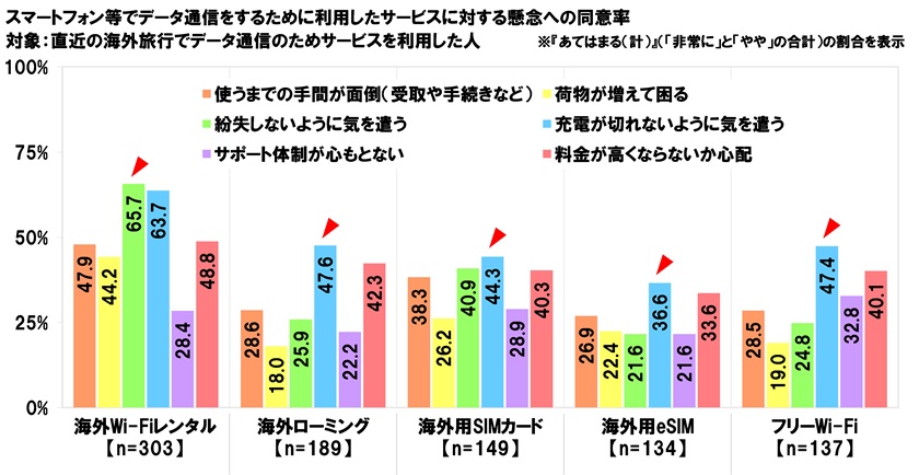 利用サービス別にみると、『あてはまる』と回答した人の割合は、”海外Wi-Fiレンタル”では「紛失しないように気を遣う」(65.7%)、それ以外のサービスでは「充電が切れないように気を遣う」(”海外ローミング”47.6%、”海外用SIMカード”44.3%、”海外用eSIM”36.6%、”フリーWi-Fi”47.4%)が最も高くなった。