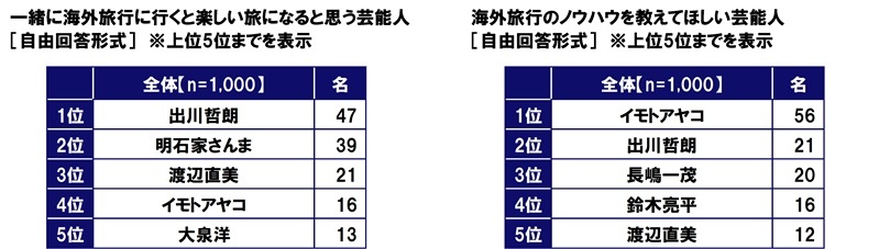 また、一緒に海外旅行に行くと楽しい旅になると思う芸能人を聞いたところ、1位「出川哲朗さん」(47名)、2位「明石家さんまさん」(39名)、3位「渡辺直美さん」(21名)、海外旅行のノウハウを教えてほしい芸能人を聞いたところ、1位「イモトアヤコさん」(56名)、2位「出川哲朗さん」(21名)、3位「長嶋一茂さん」(20名)となった。