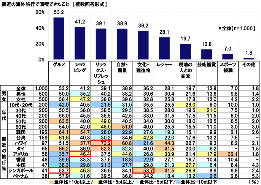 直近の旅行先別にみると、アメリカ旅行者では「ショッピング」、ハワイ旅行者では「リラックス・リフレッシュ」、シンガポール旅行者では「グルメ」「文化・建造物」が1位となった。
