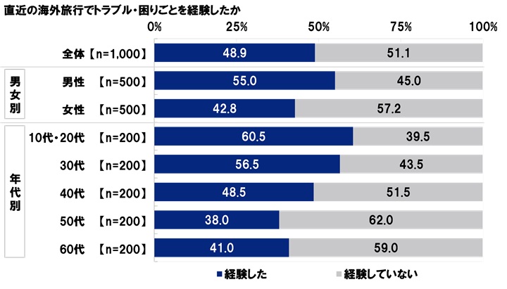 直近の海外旅行におけるトラブル・困りごとの経験率をみると、半数近く(48.9%)が何らかのトラブル・困りごとを経験したと回答しており、年代が下がるほど経験率が高い傾向がみられる。