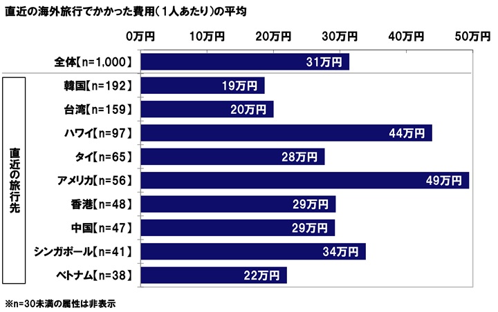 直近の旅行先別にみると、直近の海外旅行でかかった費用の平均は、韓国旅行者では19万円、台湾旅行者では20万円、ハワイ旅行者では44万円、タイ旅行者では28万円、アメリカ旅行者では49万円となった。