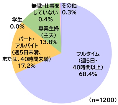 保護者の就業形態の割合は主に、フルタイム(68.4%)、パート・アルバイト(17.2%)、専業主婦(主夫)(13.8%)。