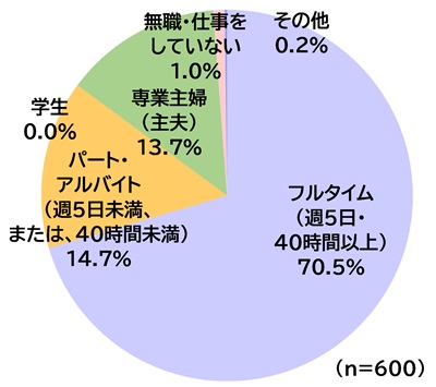 保護者の就業形態の割合は主に、フルタイム(70.5%)、パート・アルバイト(14.7%)、専業主婦(主夫)(13.7%)。