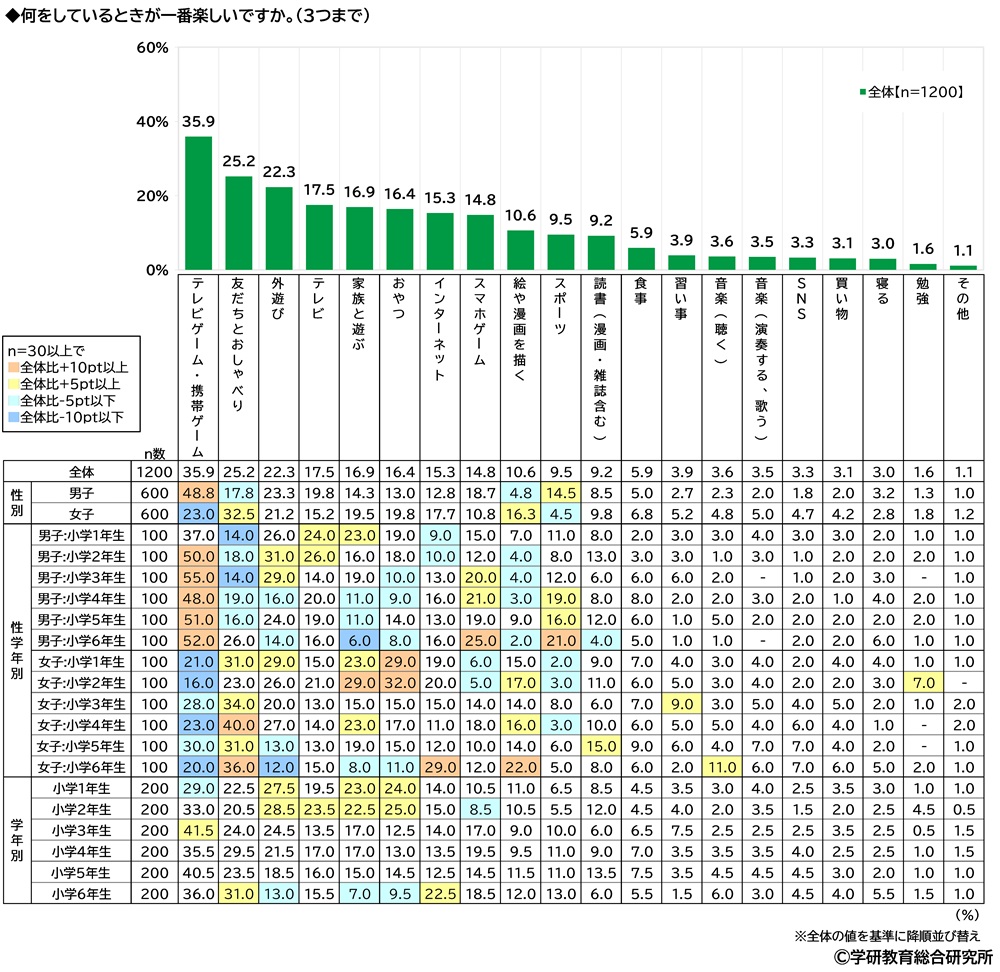 何をしているときが一番楽しいかをきいたところ、1位「テレビゲーム・携帯ゲーム」(35.9%)、2位「友だちとおしゃべり」(25.2%)、3位「外遊び」(22.3%)となりました。