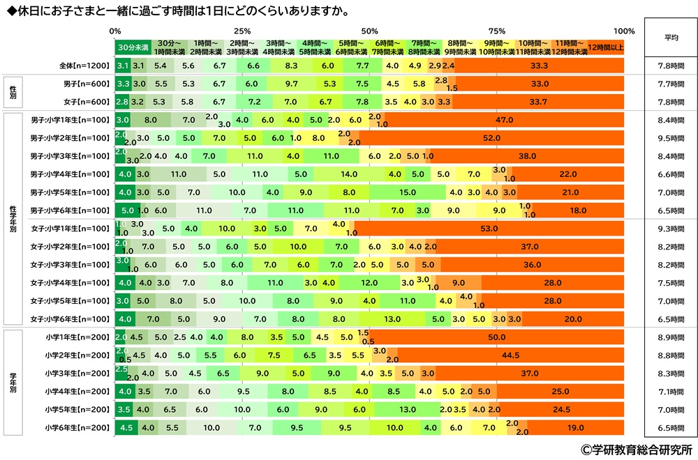 また、保護者に、休日に子どもと一緒に過ごす時間は1日にどのくらいあるかをきいたところ、「12時間以上」(33.3%)に多くの回答が集まり、平均は7.8時間でした。