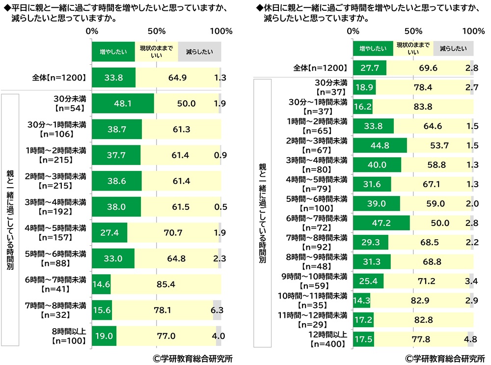 一方、保護者と一緒に過ごす時間に対する子どもの意識について、親と一緒に過ごす時間を増やしたいと思うか、減らしたいと思うかをきいたところ、【平日】では「増やしたい」は33.8%、「現状のままでいい」は64.9%、「減らしたい」は1.3%、【休日】では「増やしたい」は27.7%、「現状のままでいい」は69.6%、「減らしたい」は2.8%となりました。