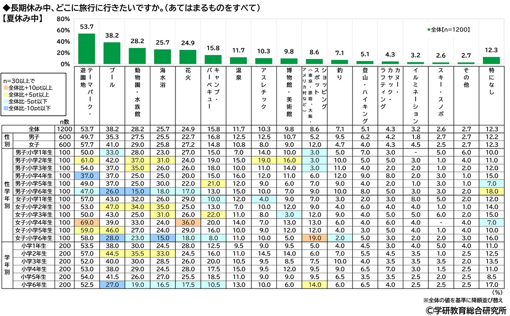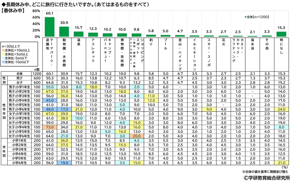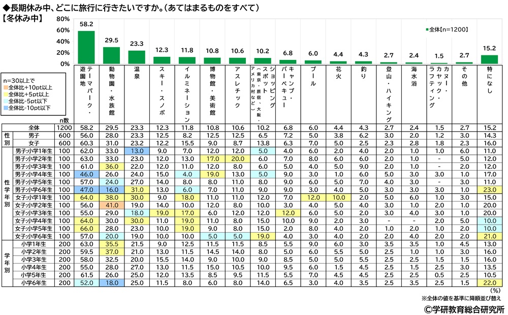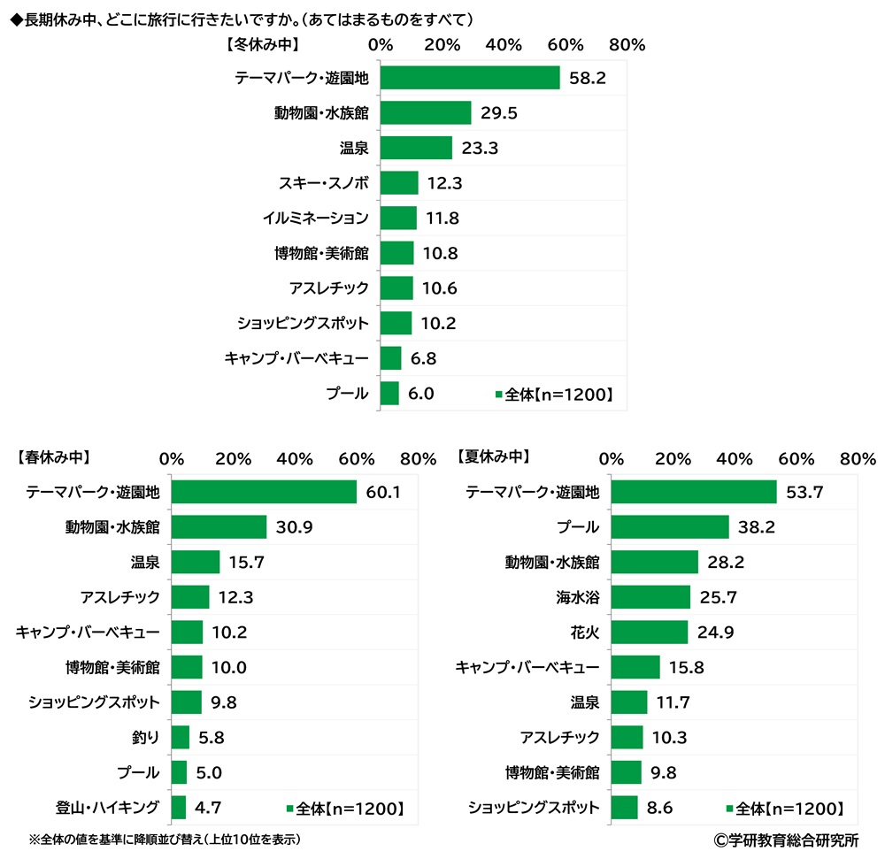 長期休み中、どこに旅行に行きたいかをきいたところ、【冬休み中】【春休み中】【夏休み中】のいずれも「テーマパーク・遊園地」(順に58.2%、60.1%、53.7%)がダントツでした。次いで、【冬休み中】と【春休み中】では2位「動物園・水族館」(29.5%、30.9%)、3位「温泉」(23.3%、15.7%)、【夏休み中】では2位「プール」(38.2%)、3位「動物園・水族館」(28.2%)となりました。