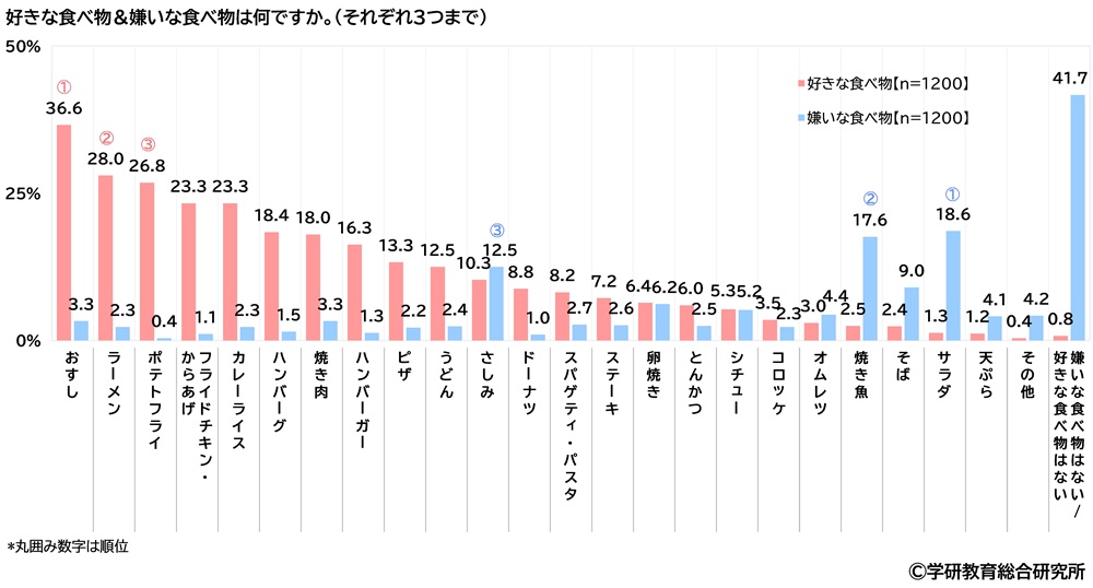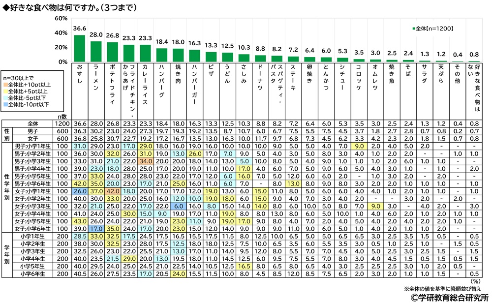 好きな食べ物をきいたところ、1位「おすし」(36.6%)、2位「ラーメン」(28.0%)、3位「ポテトフライ」(26.8%)となりました。