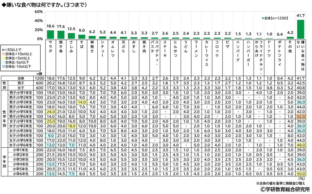前回の2023年調査と比較すると、前回調査と同様に今回調査でも「サラダ」「焼き魚」「さしみ」が嫌いな食べ物TOP3に挙がりました。
