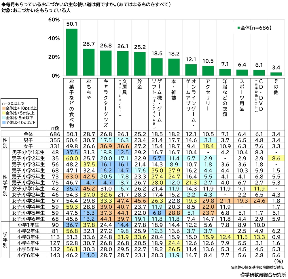小学生の毎月のおこづかいの使い道 1位「お菓子などの食べ物」、2位「おもちゃ」、3位「キャラクターグッズ」