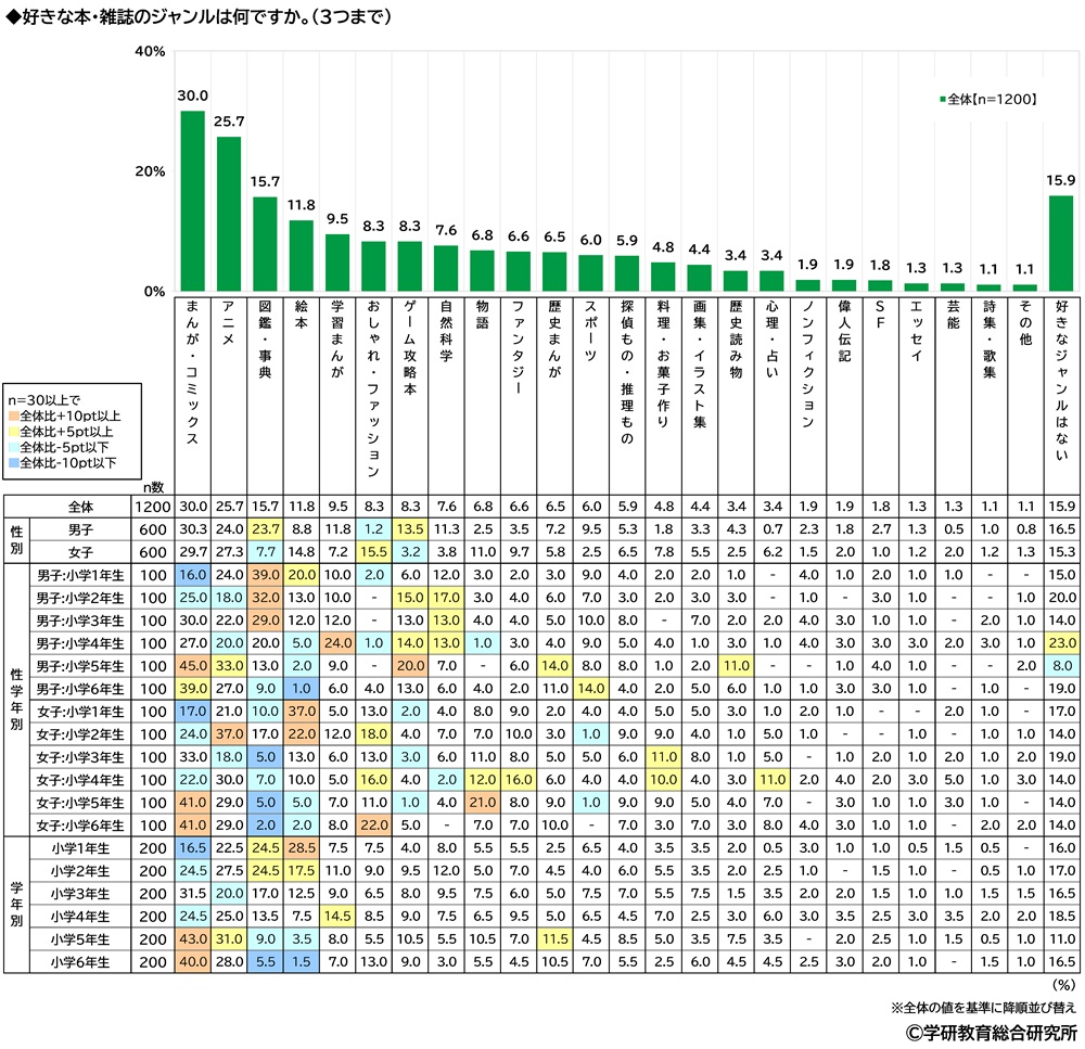 好きな本・雑誌のジャンルをきいたところ、1位「まんが・コミックス」(30.0%)、2位「アニメ」(25.7%)、3位「図鑑・事典」(15.7%)、4位「絵本」(11.8%)、5位「学習まんが」(9.5%)となりました。