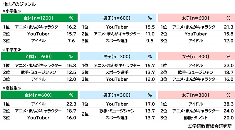 推しのジャンル 男子の1位は「YouTuber」、女子の1位は「アニメ・まんがキャラクター」