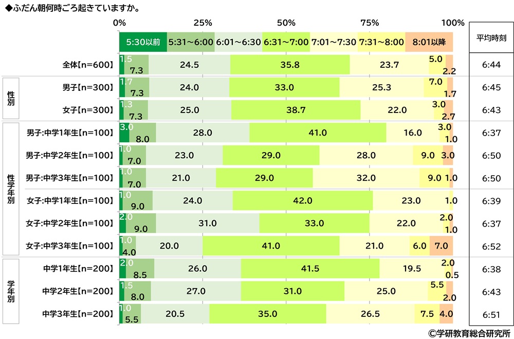 平均起床時刻は6:44、起床時刻が遅くなっている傾向が継続