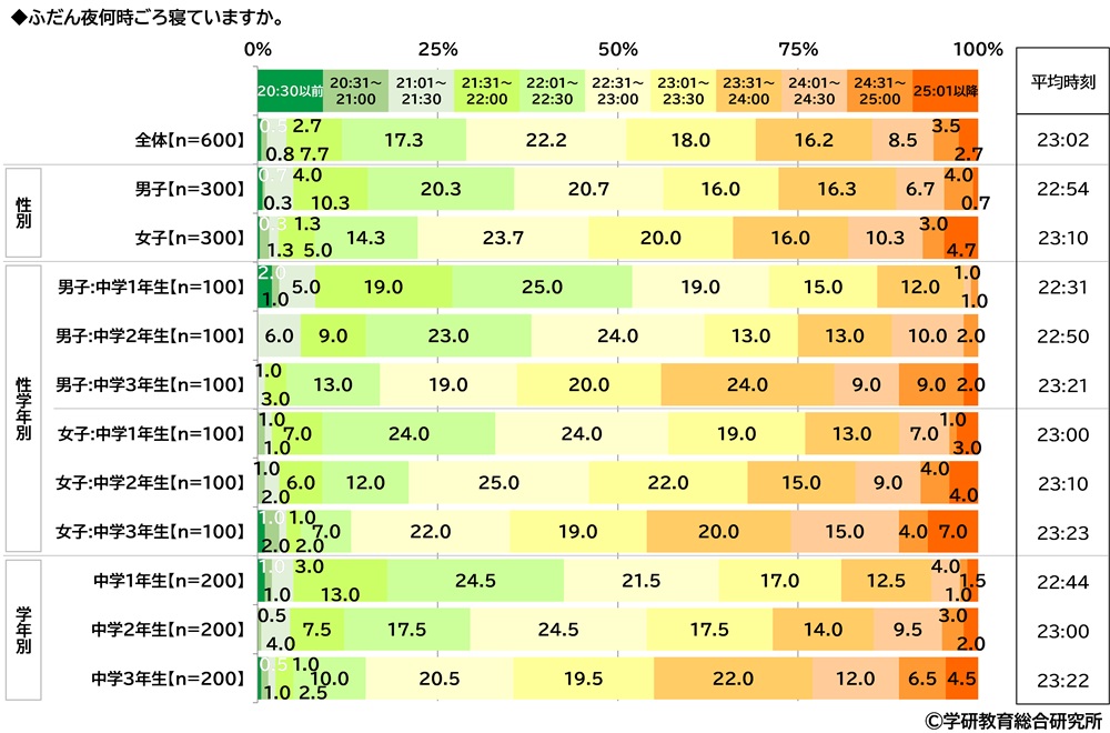 平均就寝時刻は23:02、上の学年ほど遅くなる傾向で、3年生は23:22