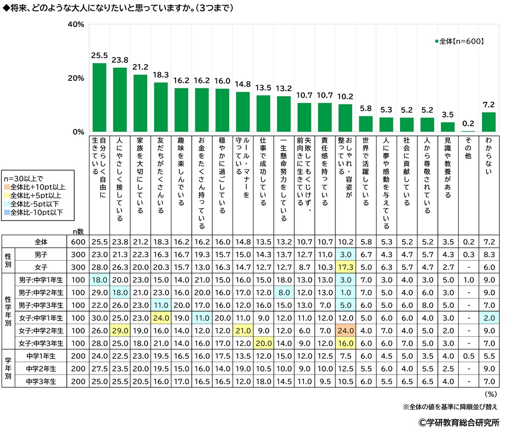 将来、どのような大人になりたいと思っているかをきいたところ、1位「自分らしく自由に生きている」(25.5%)、2位「人にやさしく接している」(23.8%)、3位「家族を大切にしている」(21.2%)、4位「友だちがたくさんいる」(18.3%)、5位「趣味を楽しんでいる」「お金をたくさん持っている」(いずれも16.2%)となりました。