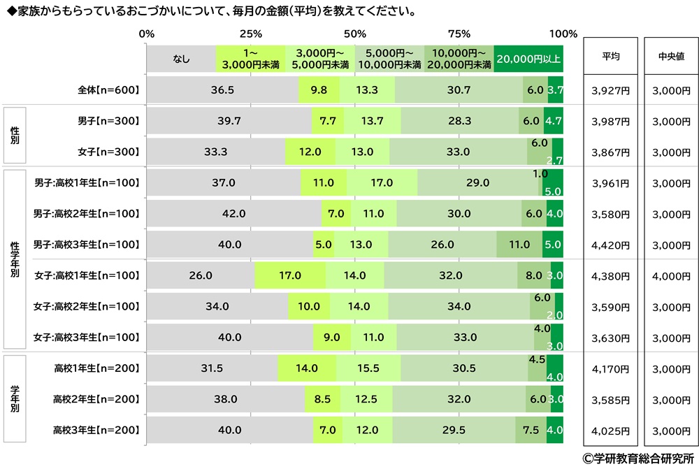 高校生が家族からもらっているおこづかい もらっている金額は平均3,927円/月