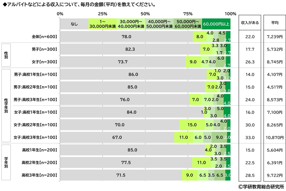 アルバイトなどによる収入について、毎月の金額(平均)をきいたところ、収入がある人の割合は22.0%となり、平均は7,239円でした。