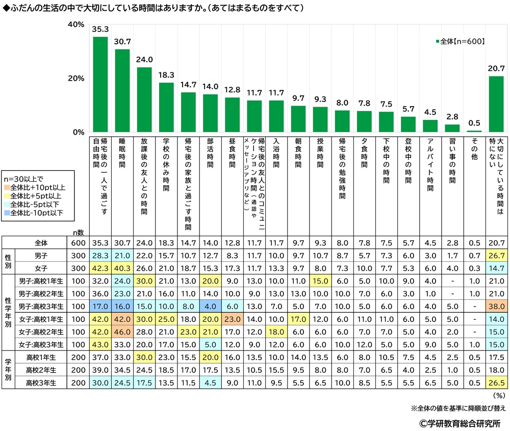 ふだんの生活の中で大切にしている時間をきいたところ、1位は「帰宅後の一人で過ごす自由時間」(35.3%)でした。ゆっくりひと息ついたり、好きなことを楽しんだりする時間は欠かせないものだと感じている人が多いようです。次いで、2位「睡眠時間」(30.7%)、3位「放課後の友人との時間」(24.0%)、4位「学校の休み時間」(18.3%)、5位「帰宅後の家族と過ごす時間」(14.7%)となりました。