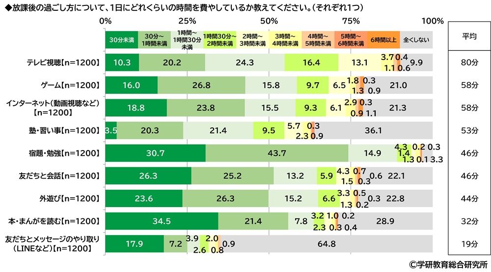放課後の過ごし方について、どのようなことに、どのくらいの時間を費やしているかをきいたところ、「テレビ視聴」が最も長く平均は80分となり、以下、「ゲーム」58分、「インターネット(動画視聴など)」58分、「塾・習い事」53分、「宿題・勉強」46分、「友だちと会話」46分、「外遊び」44分、「本・まんがを読む」32分、「友だちとメッセージのやり取り(LINEなど)」19分と続きました。