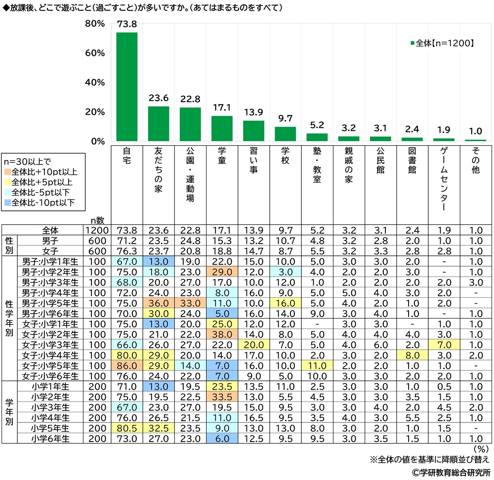 1・2年生では「学童」、3年生では「公園・運動場」、4年生以上では「友だちの家」が2位