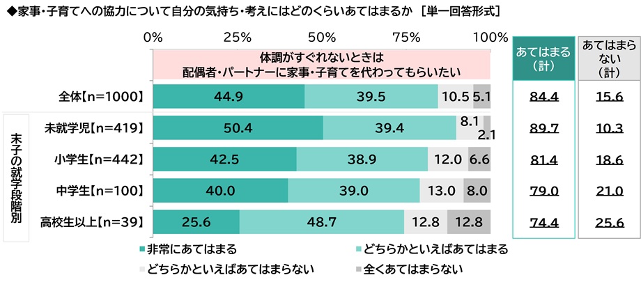 「体調がすぐれないときは配偶者・パートナーに家事・子育てを代わってもらいたい」全体の84%、