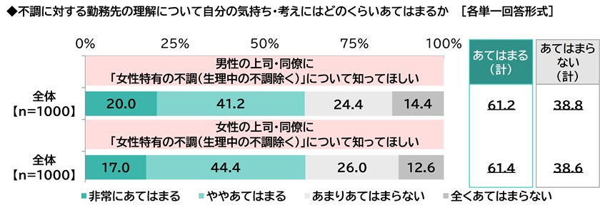 ≪上司・同僚に「女性特有の不調(生理中の不調除く)」について知ってほしい≫についてみると、男性の上司・同僚に対しては「あてはまる(計)」は61.2%、女性の上司・同僚に対しては「あてはまる(計)」は61.4%となりました。
