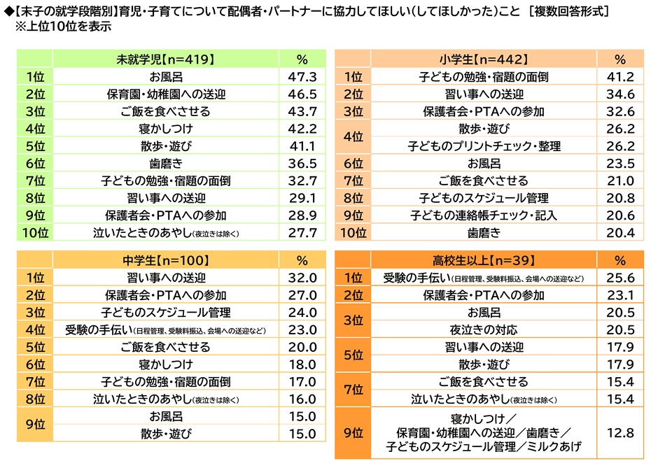 末子の就学段階別にみると、子どもが未就学児の人では、1位「お風呂」(47.3%)、2位「保育園・幼稚園への送迎」(46.5%)、3位「ご飯を食べさせる」(43.7%)、4位「寝かしつけ」(42.2%)、5位「散歩・遊び」(41.1%)となり、上位5位についてはすべて、協力してほしい(協力してほしかった)と感じるママの割合が4割を超える結果となりました。