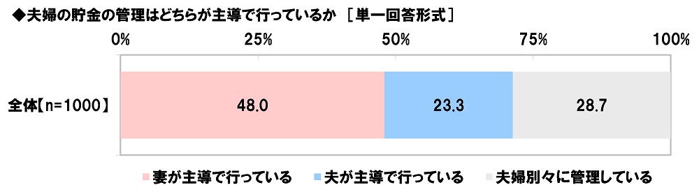 はじめに、全回答者(1,000名)に、夫婦の貯金の管理はどちらが主導で行っているか聞いたところ、「妻が主導で行っている」は48.0%、「夫が主導で行っている」は23.3%、「夫婦別々に管理している」は28.7%となりました。