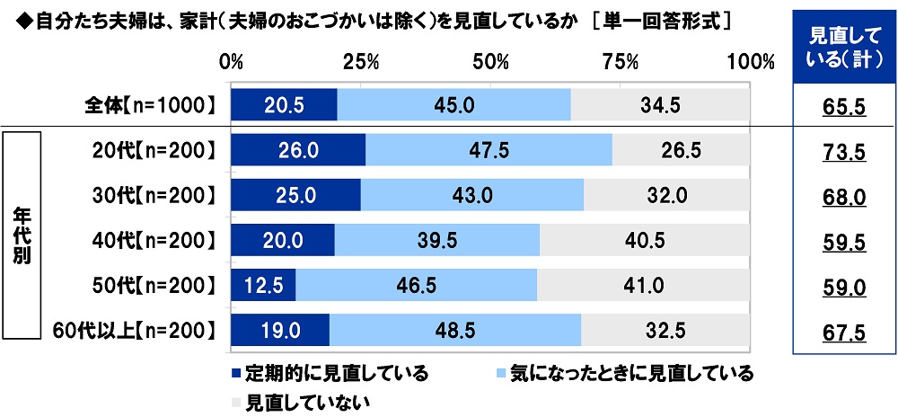 全回答者(1,000名)に、自分たち夫婦は、家計(夫婦のおこづかいは除く)を見直しているか聞いたところ、「定期的に見直している」は20.5%、「気になったときに見直している」は45.0%で、合計した『見直している(計)』は65.5%と、見直している人が多数となりました。また、「見直していない」は34.5%でした。