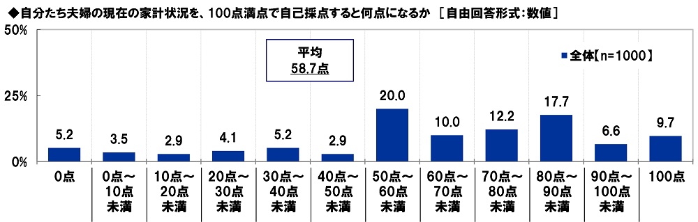 自分たち夫婦の現在の家計状況を、100点満点で自己採点すると何点になるか聞いたところ、「50点~60点未満」(20.0%)や「80点~90点未満」(17.7%)に回答が集まり、平均は58.7点でした。