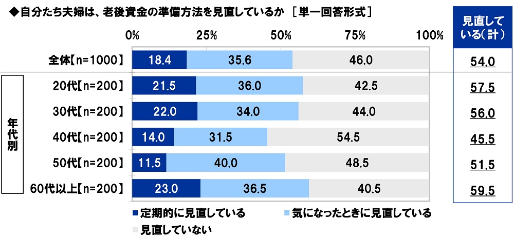 全回答者(1,000名)に、自分たち夫婦は、老後資金の準備方法を見直しているか聞いたところ、「定期的に見直している」は18.4%、「気になったときに見直している」は35.6%で、合計した『見直している(計)』は54.0%、「見直していない」は46.0%となりました。