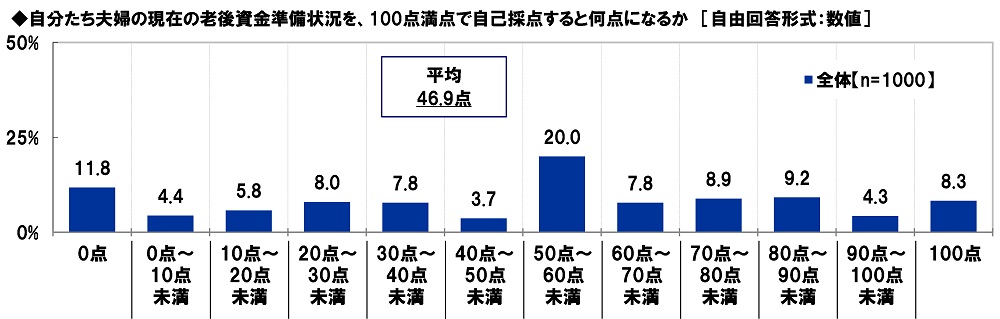 自分たち夫婦の現在の老後資金準備状況を、100点満点で自己採点すると何点になるか聞いたところ、「50点~60点未満」(20.0%)に回答が集まり、平均は46.9点となりました。