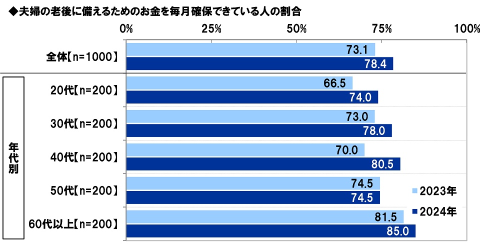 「夫婦の老後に備えるためのお金を毎月確保できている」78%、昨年調査から5ポイント上昇