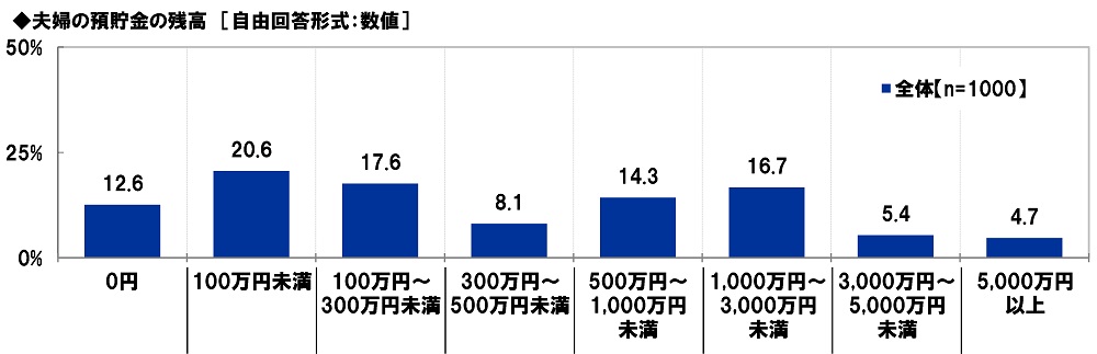 夫婦の預貯金の残高を聞いたところ、「100万円未満」(20.6%)や「100万円~300万円未満」(17.6%)、「500万円~1,000万円未満」(14.3%)、「1,000万円~3,000万円未満」(16.7%)などに回答が分かれ、平均は968万円でした。
