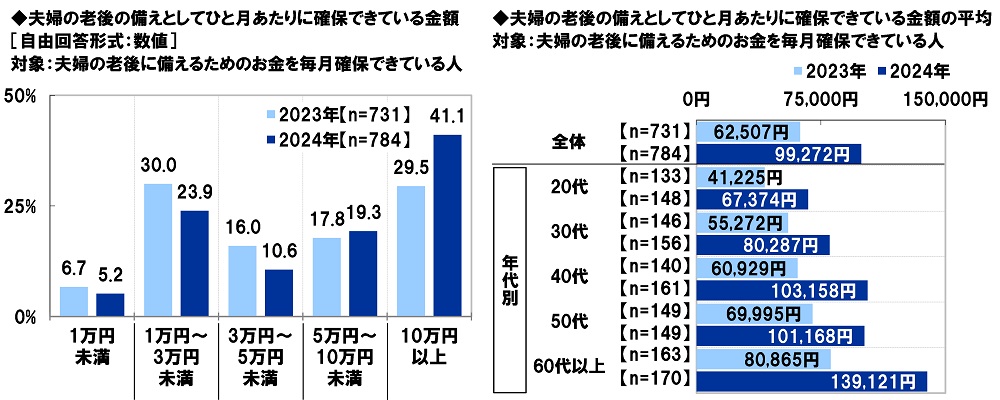 昨年の調査結果と比較すると、「10万円以上」は11.6ポイント上昇(2023年29.5%→2024年41.1%)しました。また、ひと月あたりに確保できている金額の平均は36,765円の大幅増加(2023年62,507円→2024年99,272円)となり、年代別にみると、60代以上では58,256円の増加(2023年80,865円→2024年139,121円)と、増加幅が大きくなりました。