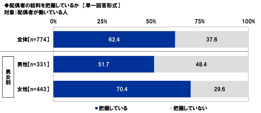 男女別にみると、「把握していない」は男性では48.4%と、女性(29.6%)と比べて18.8ポイント高くなり、妻の給料を知らない夫が約半数を占める実態が明らかになりました。