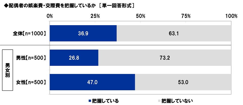 全回答者(1,000名)に、配偶者の娯楽費・交際費を把握しているか聞いたところ、「把握している」は36.9%、「把握していない」は63.1%となりました。