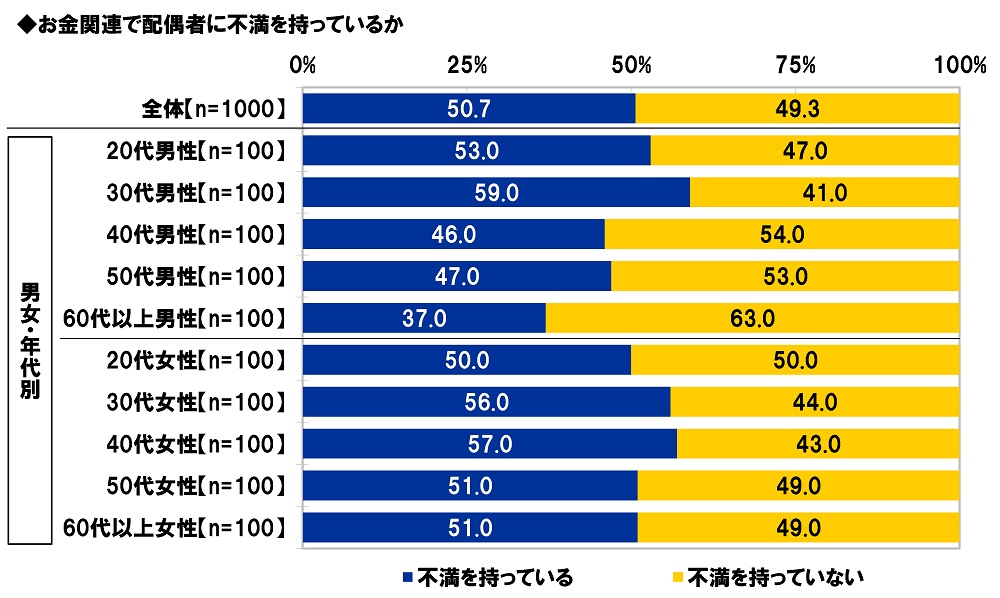 全回答者(1,000名)に、お金関連で配偶者に不満を持っているか聞いたところ、「不満を持っている」は50.7%、「不満を持っていない」は49.3%でした。