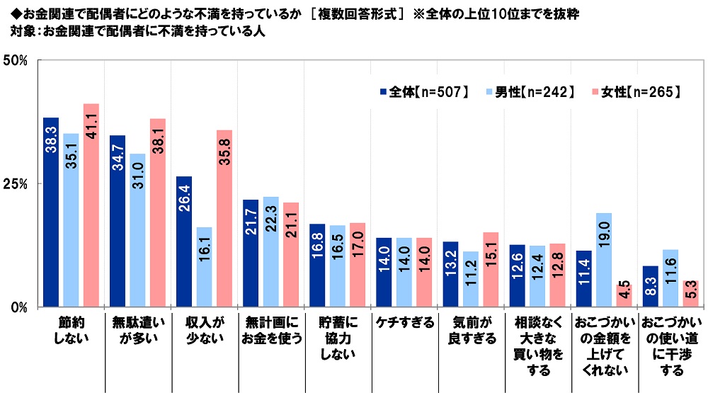 お金関連の配偶者への不満 1位「節約しない」2位「無駄遣いが多い」3位「収入が少ない」