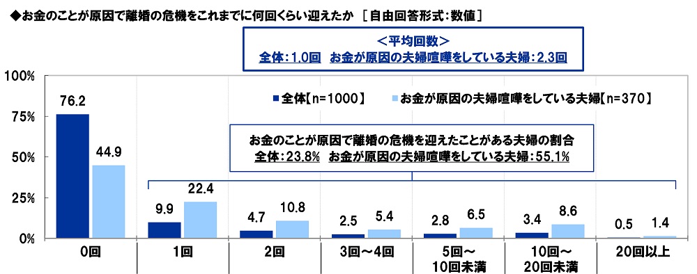 また、お金のことが原因で離婚の危機をこれまでに何回くらい迎えたか聞いたところ、「0回」は76.2%、『お金のことが原因で離婚の危機を迎えたことがある夫婦の割合』(1回以上と回答した人の割合)は23.8%となりました。お金のことが原因で離婚の危機を迎えた回数は平均1.0回/年でした。